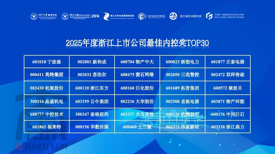 On November 20, at the 9th Forum on Enterprise High-Quality Development and Management Innovation held at Zhejiang University, we were once again honored with a place on the “2025 Top 30 Zhejiang Listed Companies for Best Internal Control”.
